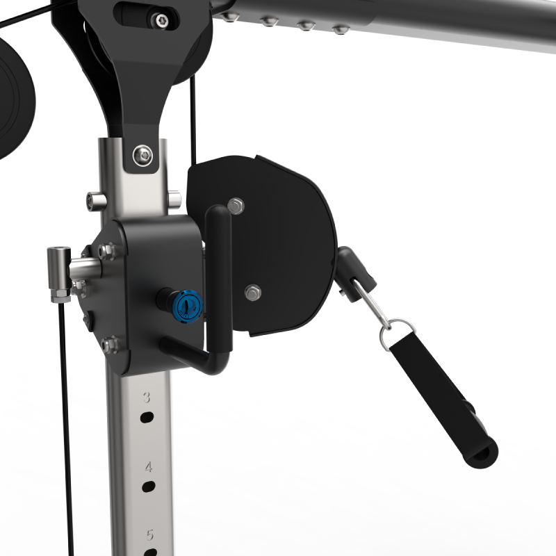 - Resistencia de Relación de Poleas 2:1 Las poleas de la OB-MO2-F21 están orientadas en una proporción de 2:1 para un mayor rango de movimiento, se pueden ajustar fácilmente en altura con pasadores tipo gatillo y giran 180° para un entrenamiento más cómodo y adaptarse a una mayor variedad de posibilidades de ejercicio.