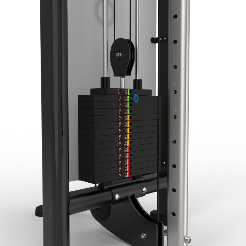 - Contrapeso. 100 kg en placas de acero sólido. La placa de peso superior está equipada con bujes autolubricantes. El pasador selector de peso se bloquea magnéticamente en su lugar y se conecta al stack para evitar pérdidas.